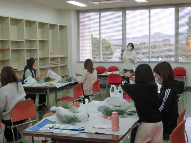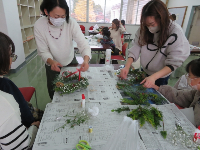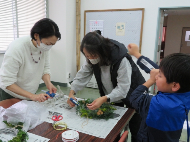 材料等の事前準備も入念にしていただき、丁寧に分かり易く指導していただきました。受講者からも、「とても香りの良いリースができました。」「素敵な作品ができました。」「手作りの温かい作品ができ、大変満足です。」という感想をいただいています。親子で共同で作る楽しい時間がもてたと思います。